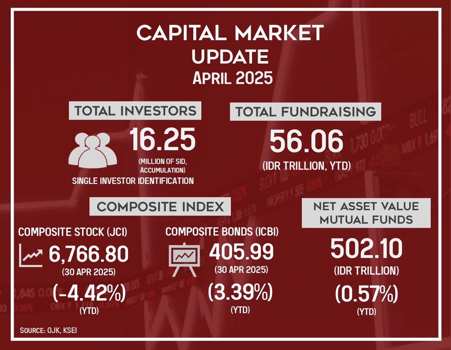Capital fundraising in the capital market reached IDR56.06 trillion. The Jakarta Composite Index (IHSG) stood at 6,766.80, reflecting a YTD return of -4.42%, in line with a period of adjustment observed in several regional markets. Meanwhile, the Indonesia Composite Bond Index (ICBI) showed steady growth, reaching 405.99 with a YTD increase of 3.39%.